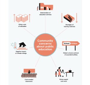 The executive summary concludes that capturing the perspectives of the 616 frontline workers and community members, the research reveals public education and healthcare services are “plagued by staffing shortages, inadequate infrastructure, and financial barriers — leading to violations of people’s rights to health and education”.
