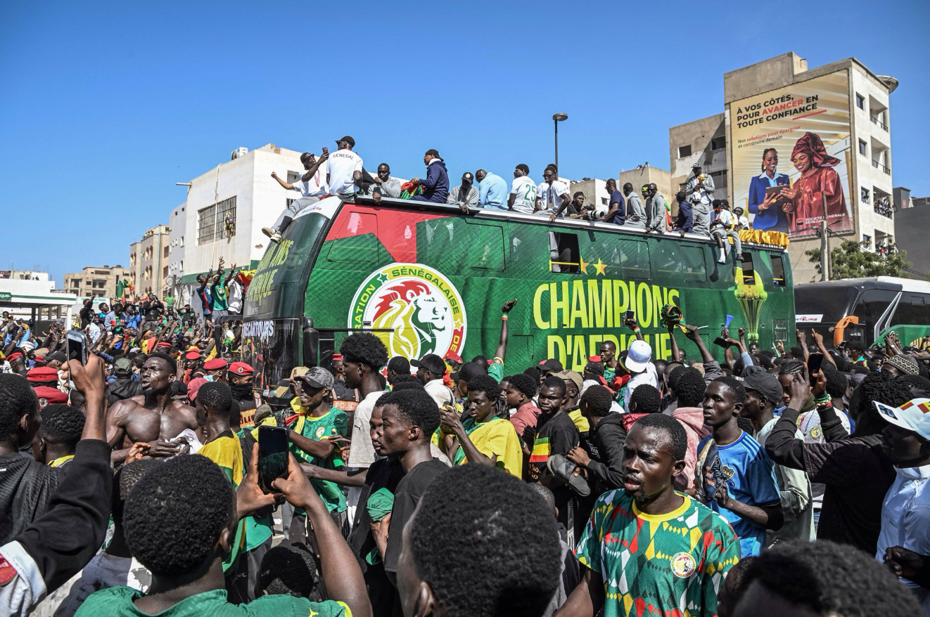 Senegal’s national football team players greet a crowd of supporters while riding on an open bus during an AfCON trophy parade back home in Dakar on January 20