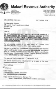 * As civil servants, as the strongest stakeholders in the Fund, threaten to hold vigils at offices and homes of the PSPTF Board of Trustees By Duncan Mlanjira Malawi Revenue Authority (MRA) granted Yusuf Investments Ltd duty waivers on some of the imported construction materials for Amaryliss Hotel in 2016, indicates a document, MRA/CE/TECH/CPC 445, that is circulating on social media. It was issued by Commissioner-Customs and Excise, Fatch Valeta on October 31 2016 having being approved by the…
