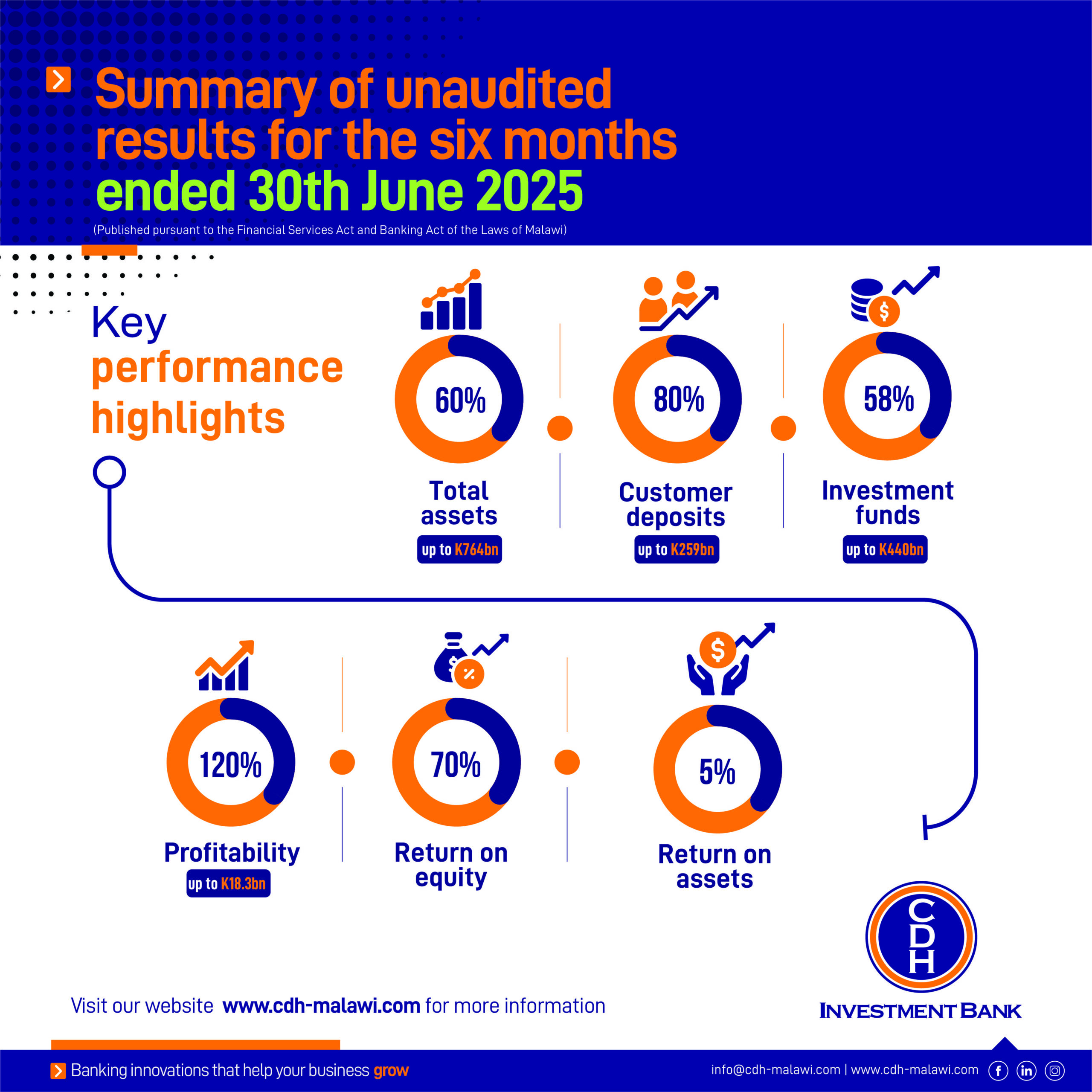 CDH Investment Bank (CDHIB) has reported strong interim results for the half year ended June 30, 2025, posting a profit after tax of MK18.3 billion, representing approximately 120% increase from the MK8.3 billion recorded during the same period in 2024.