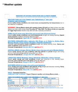 “During this period, we are also likely to experience Chiperoni Weather, which is associated with rain drizzle, windy, cloudy and chilly conditions — including fog patches over many areas beginning from the southern Malawi progressing northwards.