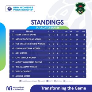 Ascent Soccer thus enhances their second position with 35 points, four ahead of FCB Nyasa Big Bullets, who claimed Blantyre City derby bragging rights after defeating rivals Mighty Wanderers Queens 1-0 at Mpira Stadium.
