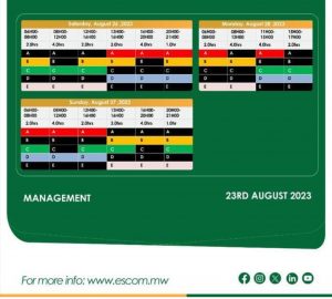 “Customers are categorized in five groups: A, B C, D and E. In the load-shedding time table, each customer group will have no supply during the time indicated in Black. A full schedule indicating feeders and actual areas will be released later on www.escom.mw and social media platforms.