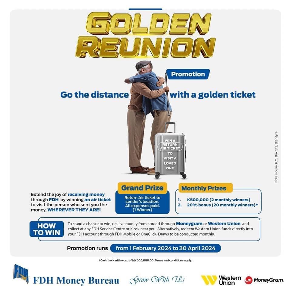 Two lucky winners, Mercy Sala and Daison Andrew Mongolo have earned K500,000 each in the first draw of the FDH Money Bureau promotion dubbed Golden Reunion — that entices Malawians in diaspora to send money to their loved ones back home through Western Union and Money Gram.