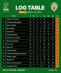 Week 14 results were Mighty Wanderers drawing 1-1 with Chitipa United; Silver Strikers 0-0 Mighty Tigers; Kamuzu Barracks 3-0 Blue Eagles; MAFCO 0-1 Nyasa Big Bullets; Civil Service United 4-0 Mzuzu City Hammers and Moyale 0-1 Karonga United.—Reporting for MANA by Santos Zefania