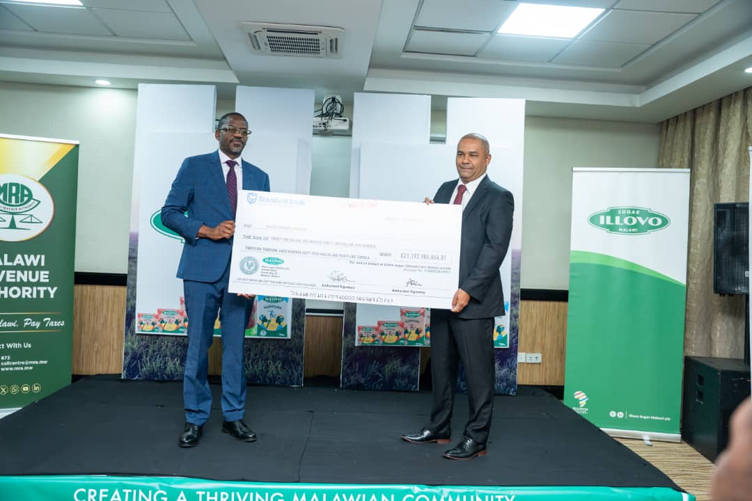 Illovo’s Managing Director Ronald Ngwira (right) hands over the tax remittance to MRA’s Commissioner General Daniel Daka