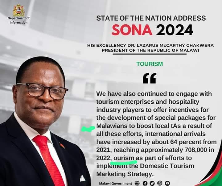 The Department of Information posted on Malawi Government Facebook page highlights of President Lazarus Chakwera’s State of Nation Address (SONA) he presented in Parliament on Friday but the one on tourism has been edited.