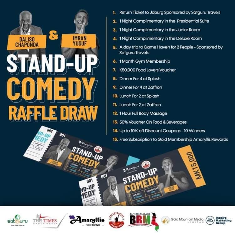 England-based stand-up comedian, Daliso Chaponda is set to mesmerize Malawians in a joint show with British comedian Imran Yusuf scheduled for Sunday, August 7 at Amaryllis Hotel and on menu will also be a raffle draw which has fantastic prizes up for grabs.