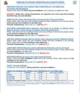“Any potential impacts on Malawi weather will be promptly communicated to the nation,” says the statement and in its weather forecast for tonight and tomorrow, the DCCMS says the publish should expect sunny, hazy and hot to very hot conditions due to influence of easterly air mass.