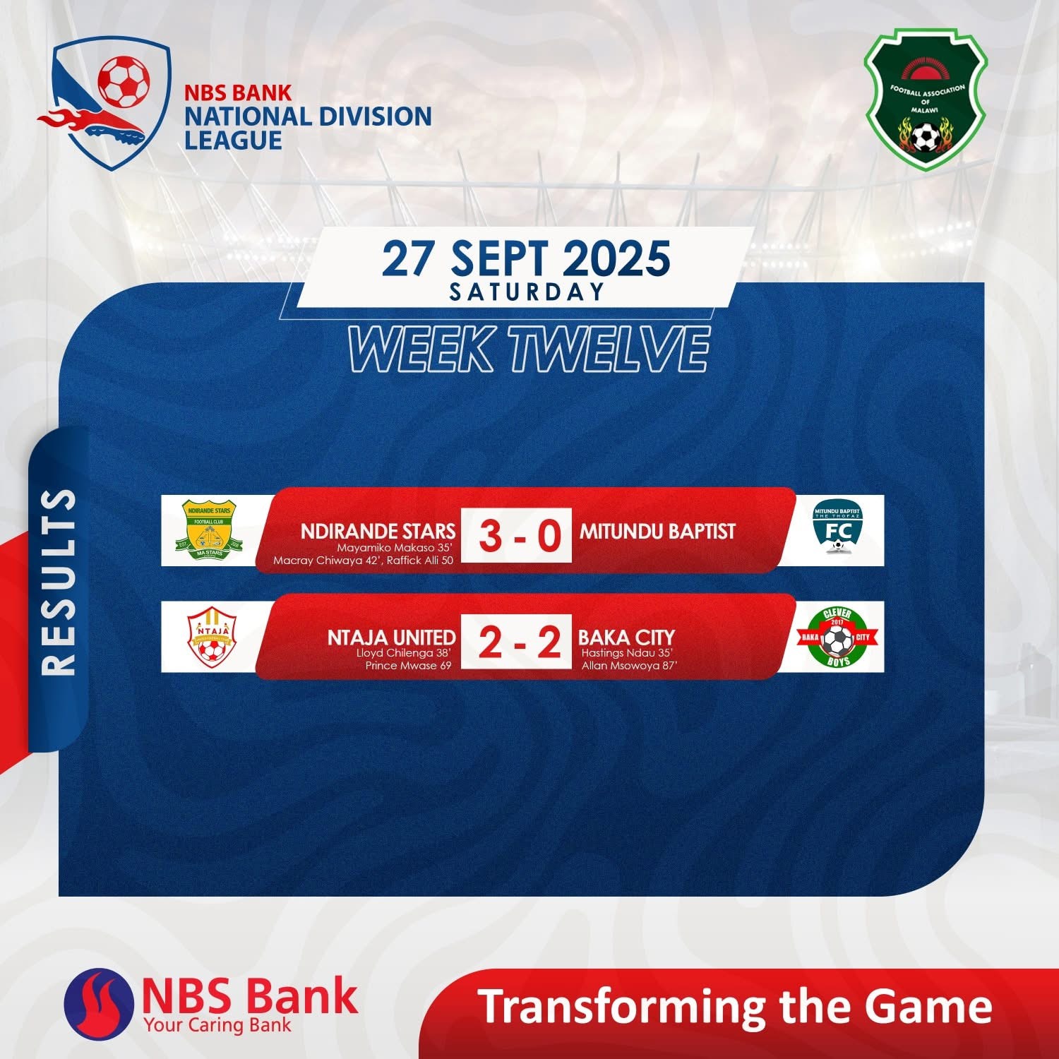 Ntaja made a double substitution a minute after resumption taking out Harrison Phiri for Pilirani Luka and Joseph Ziba for Prince Mwase and Baka also responded with a double — Enock Kaonga out for Brian Simwayi and Satiel Chirambo paving way for Bathel Chilongo.
