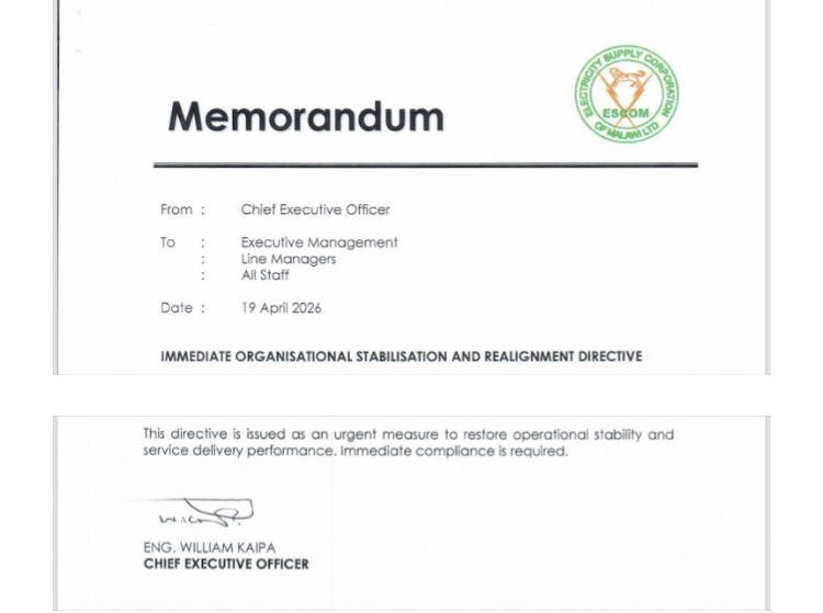 Newly-appointed Electricity Supply Corporation of Malawi (ESCOM) Chief Executive Officer (CEO), Eng. William Kaipa has hit the ground running by issuing directives as an urgent measure to restore the power utility service provider’s “operational stability and service delivery performance” — with emphasis that “immediate compliance is required”.