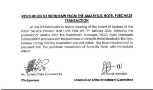 “Public statement have suggested that there was no evidence that a previous Board had rejected the transaction. However, records show that at the 5th extraordinary Board of Trustees meeting held on January 17, 2024, it was resolved to withdraw from the AmaryllisHotel purchase after professional advice that the investment was not viable at approximately MK47 billion.