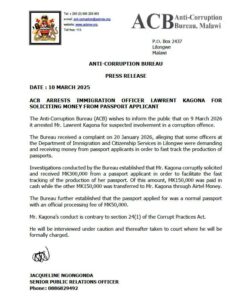 In the statement, Ngongonda indicated that the arrest follows investigations into corruption allegations at the Department of Immigration & Citizenship Services in Lilongwe where it was established that Kagona allegedly received MK150,000 in cash and another MK150,000 through Airtel Money, despite the official passport processing fee being MK50,000.