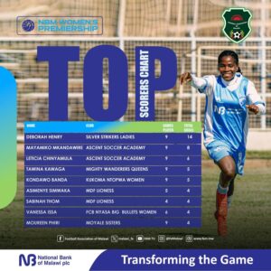 At four goals apiece are MDF Lionesses’ internationals, Asimenye Simwaka & Sabina Thom; FCB Nyasa Big Bullets’ Vanessa Issa and Moyale Sisters’ Maureen Phiri — while Ascent Soccer’s Alephar Chimbeta leads the assists table with four assists, highlighting her playmaking influence in midfield.