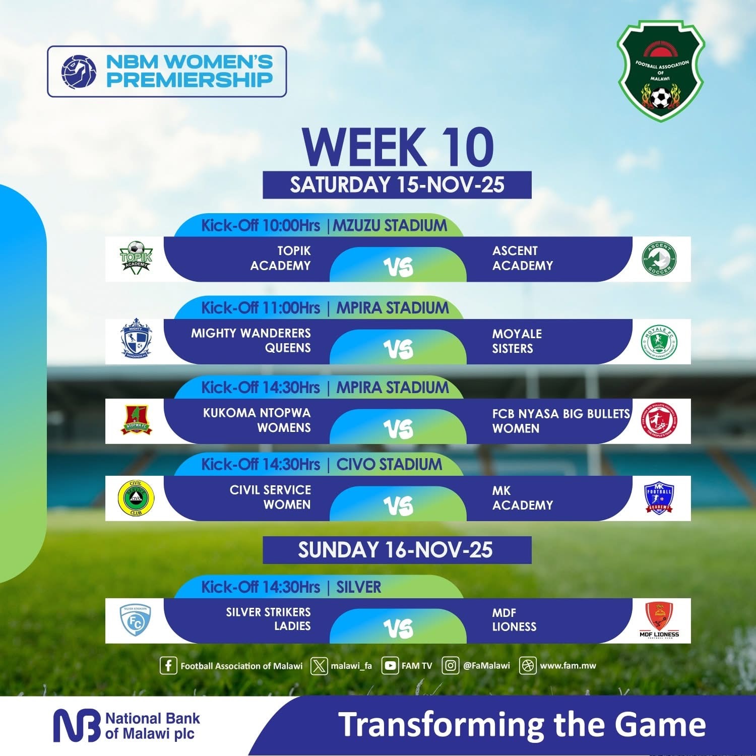 * Leaders, Silver Strikers Ladies hosting MDF Lionesses at Silver Stadium on Sunday, while Nyasa Big Bullets (5th) up against Kukoma Ntopwa (6th) at Mpira Stadium on Saturday (both kicking off 14h30)