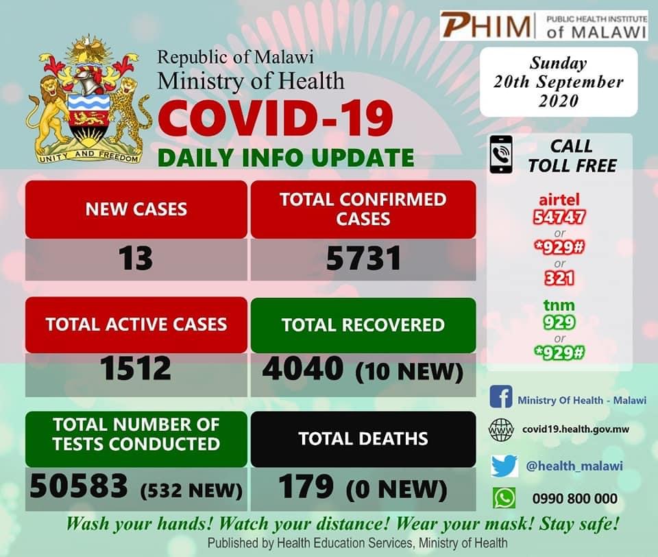Since the first case in April, Malawi has registered 5,731 COVID-19 cases of which 1,146 are imported infections and 4,585 are locally transmitted.