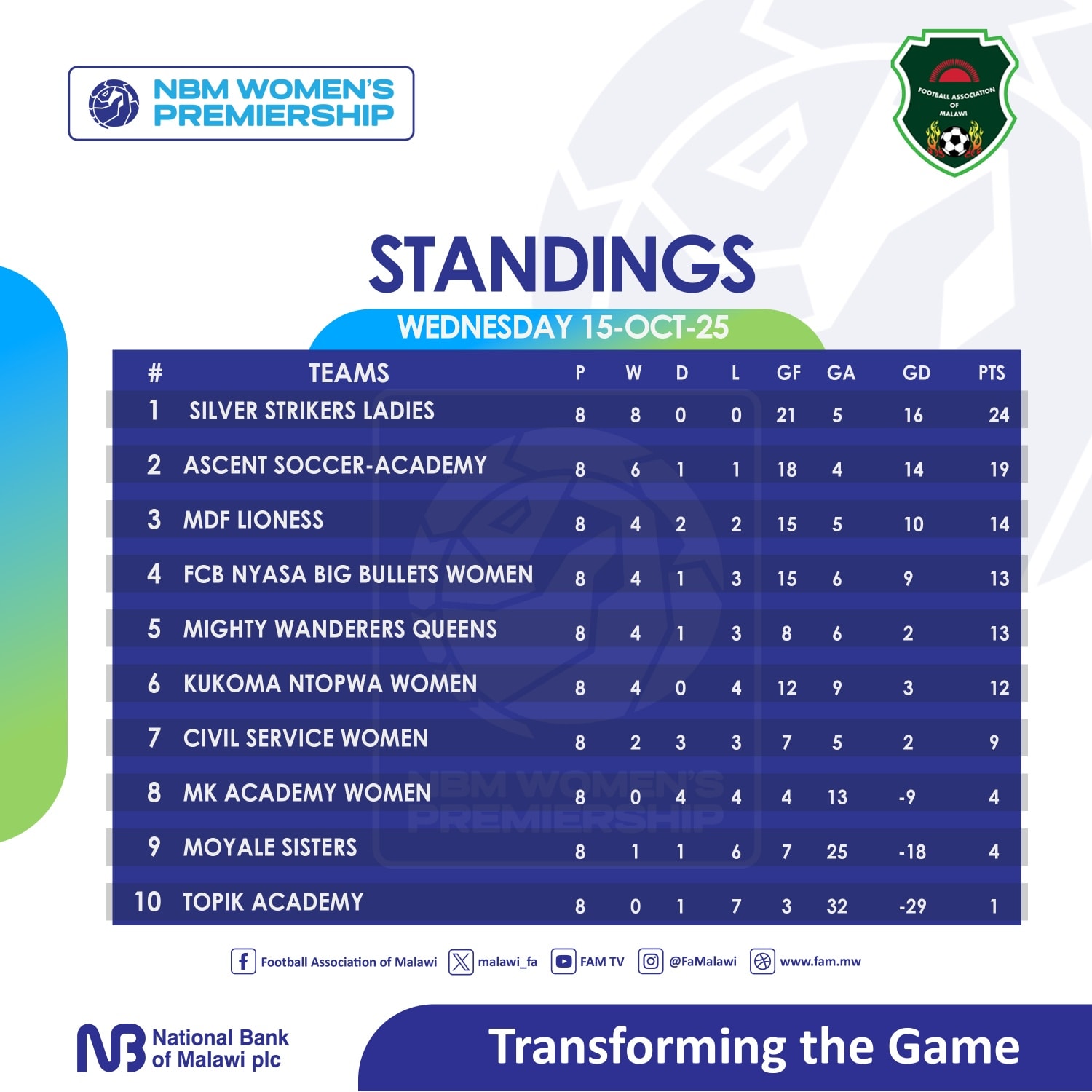 As it is with one Match Week left, Silver Ladies lead with 24 points; Ascent Soccer 2nd (19pts); MDF Lionesses 3rd (14pts); Bullets Women 4th (13pts); Wanderers Queens 5th (13pts); Kukoma Ntopwa 6th (12pts); Civil Service 7th (9pts); MK Academy 8th (4pts); Moyale Sisters 9th (4pts); and Topik Academy 10th (1pt).