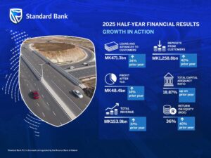 From the total revenue that Standard Bank Plc made of MK153.9 billion in the financial results for the six months ended June 30, 2025, a profit after tax of MK48.4 billion has been posted — representing a 14% increase from the previous year’s same period.