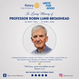 “The Rotary Club of Blantyre extends its heartfelt condolences to his family, friends, colleagues, former students, and all whose lives he touched. May his soul rest in eternal peace.
