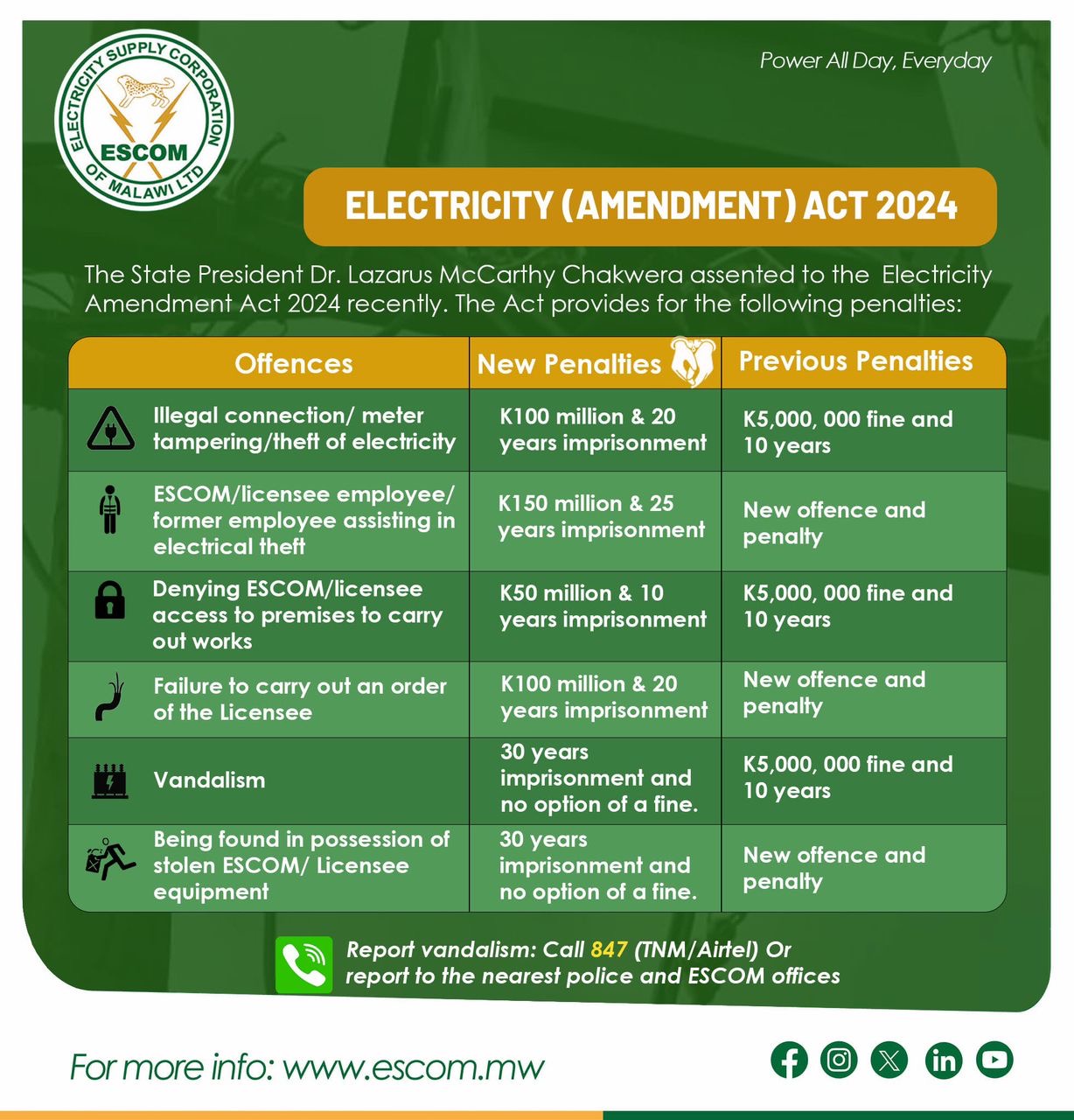 It seems the maximum 30-year jail term with no option of paying a fine for vandalism of Electricity Supply Corporation of Malawi (ESCOM) assets — as per the Electricity Amendment Act of 2024 — is not acting as a deterrent as enemies of progress are still carrying on with the vice.