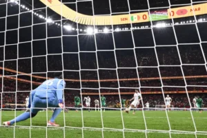 Morocco’s Brahim Diaz takes his penalty, which was saved by Senegal goalkeeper Édouard Mendy. (AFP/Getty Images)