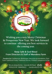Located between Malosa and Machinga along the Zomba-Lilongwe/Mangochi Road, The Village @ Mandevu Farm’s mouth-watering menu for Christmas Day as well New Year’s Day include traditional meals offering Chigwada, Zipokolo, nyama yotendera, smoked Bombe, Zikanyanga, Thelele, Chilembwe, Nkhunda, Zinzili and others.