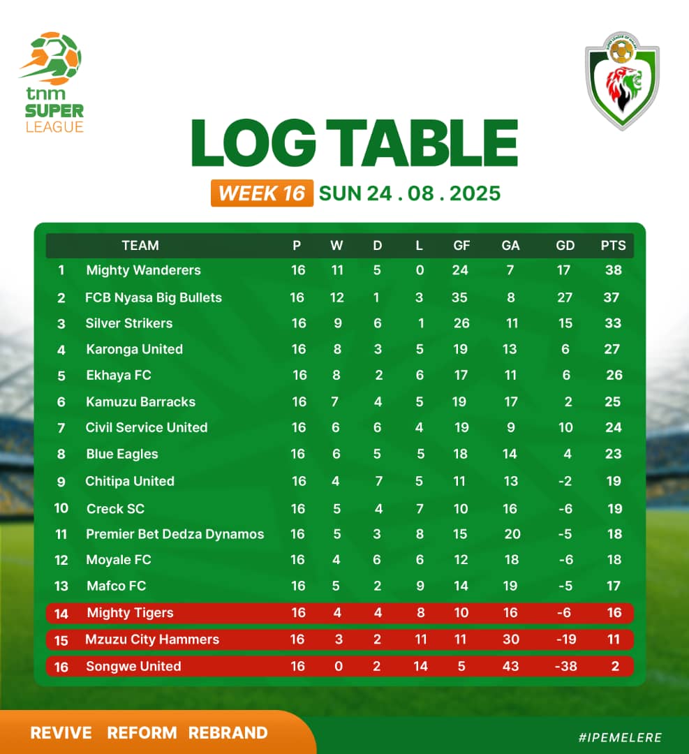 Facing relegation are Mchinji Villa on 9th with 13 points, Ntaja United on 10th (11 points), Chilumba Barracks on 11th (11 points) and Jenda United at the bottom with just three points.